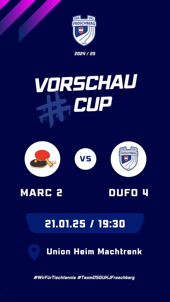 Am 24.01.2025 tritt DUFO 4 im CUP gegen Marchtrenk (MARC 2) an. Es wird ein hart umkämpftes Spiel erwartet, bei dem sich unsere Spieler auf dem Tisch alles abverlangen werden. Seid dabei und unterstützt uns bei diesem wichtigen Duell! 🏓💪